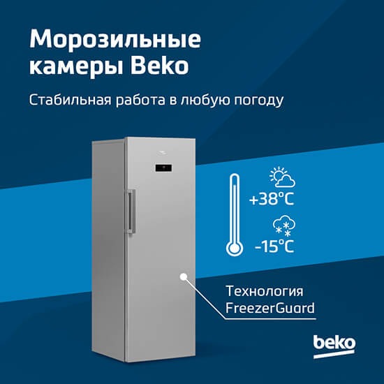 Технология FreezerGuard от Beko обеспечивает исправную работу морозильной камеры даже при низких температурах окружающей среды — морозилка может работать с неизменной производительностью в неотапливаемом помещении при температуре до −15 °С.