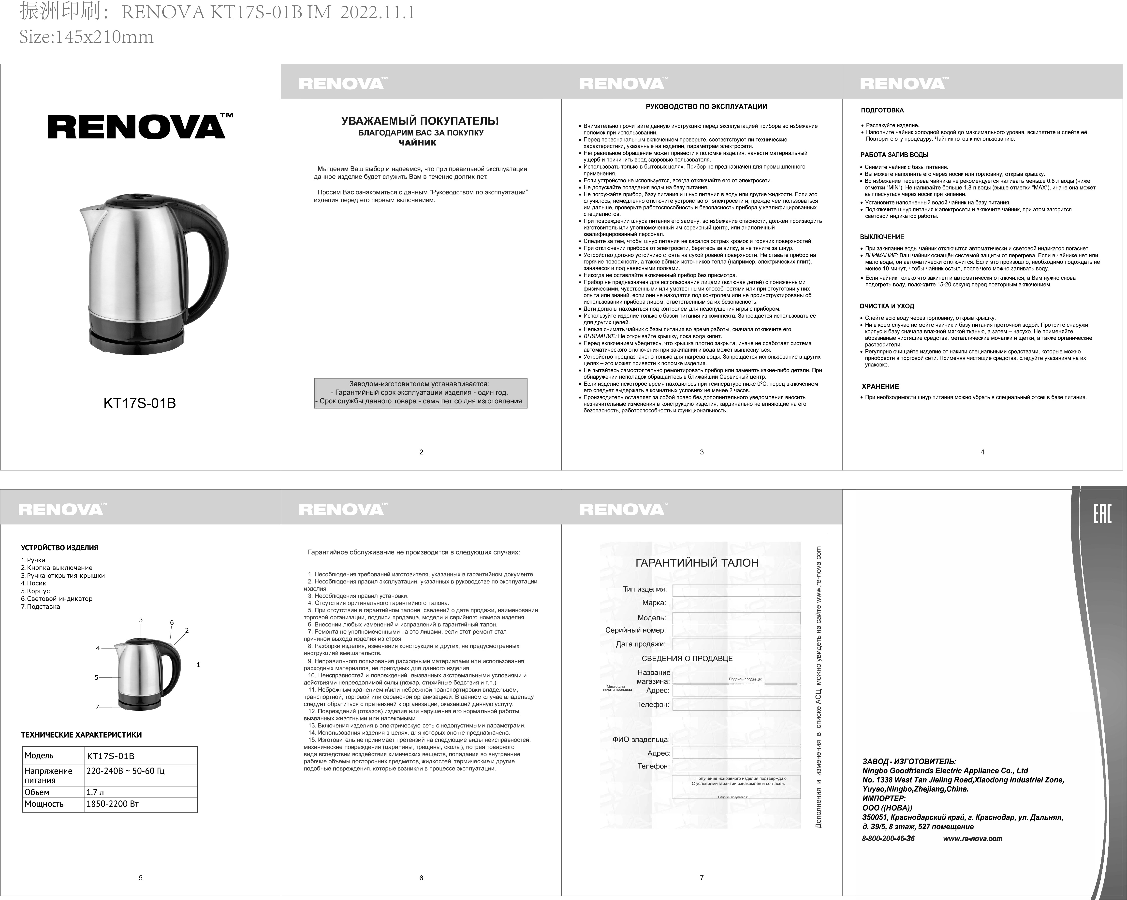 Чайник RENOVA KT17S-01B из нержавеющей стали: стильный и функциональный. Объем и мощность. RENOVA KT17S-01B имеет объем 1.7 литра, что позволяет приготовить достаточное количество напитка для всей семьи или гостей. Мощность чайника составляет 2200 Вт, что обеспечивает быстрое нагревание воды.