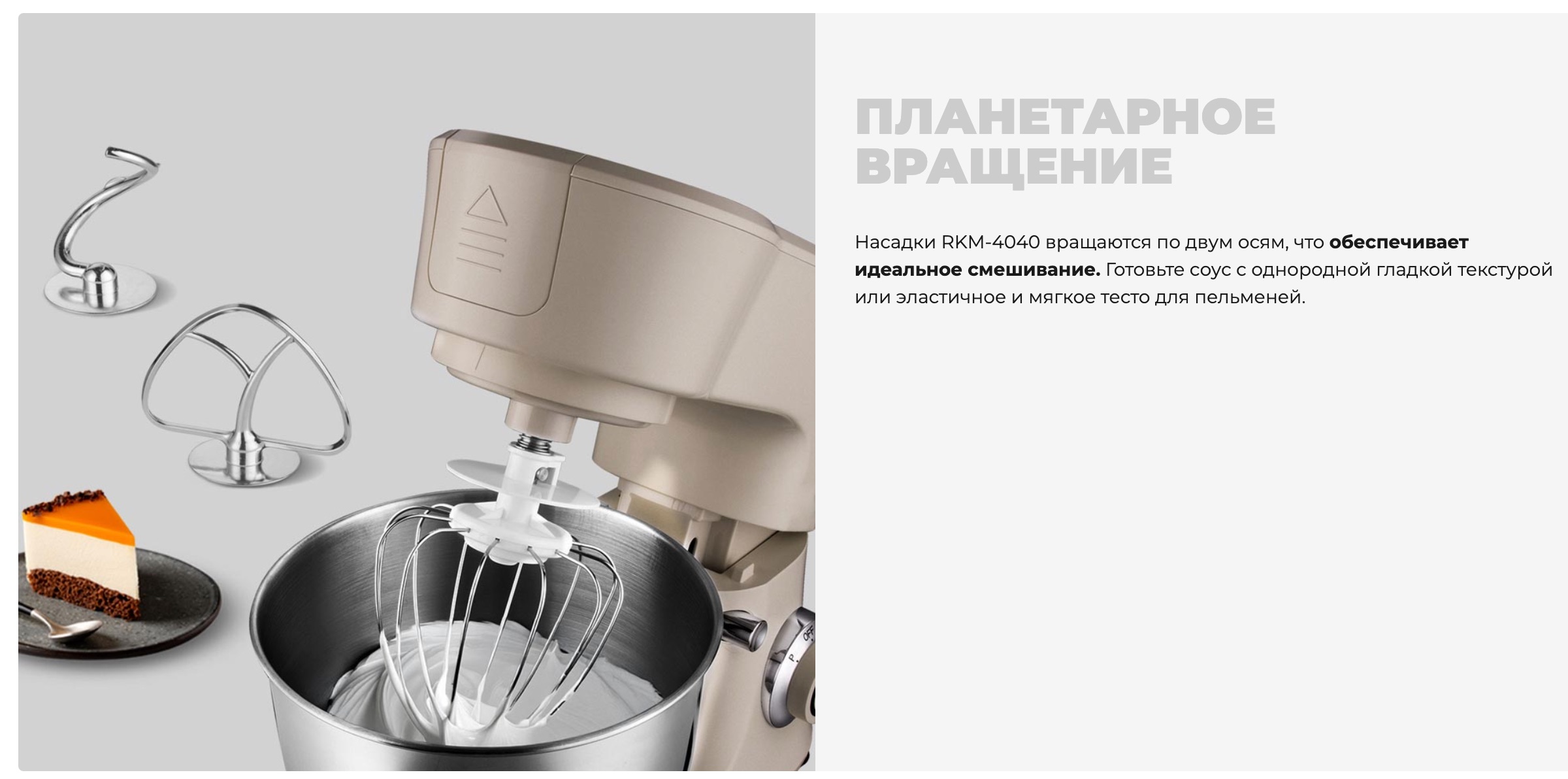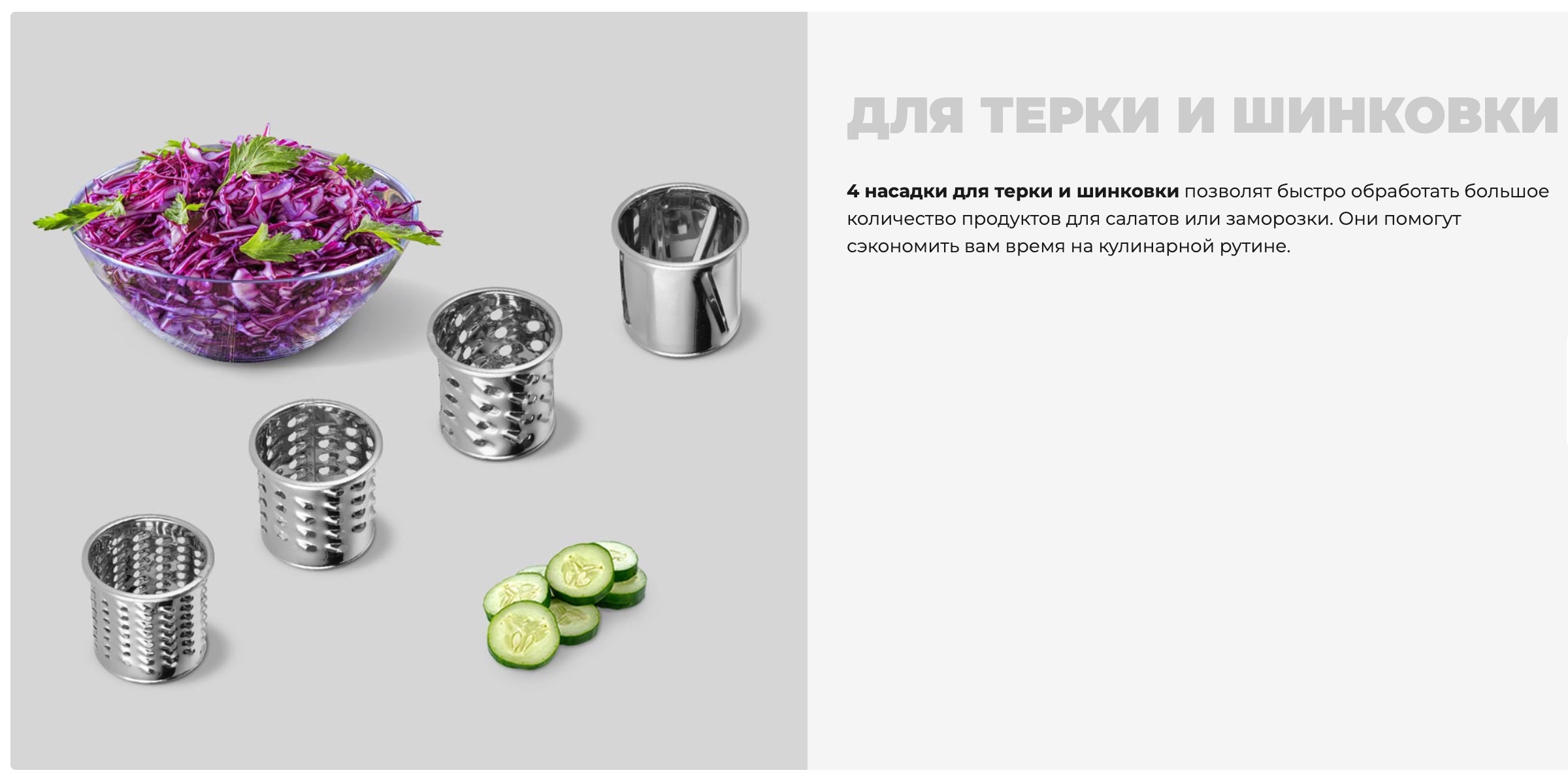 Кухонная машина РЕДМОНД RKM-4040 с комплектом насадок для различных кулинарных целей облегчит приготовление сложных блюд. Она поможет взбить яичные белки в пышную пену, вымесить вязкое тесто и приготовить суп-пюре. Благодаря 2 дискам для фарша и насадкам для колбасок заменит мясорубку, а 4 насадки для терки и шинковки позволят использовать прибор как овощерезку. Скорость работы легко регулировать — доступно 6 режимов.