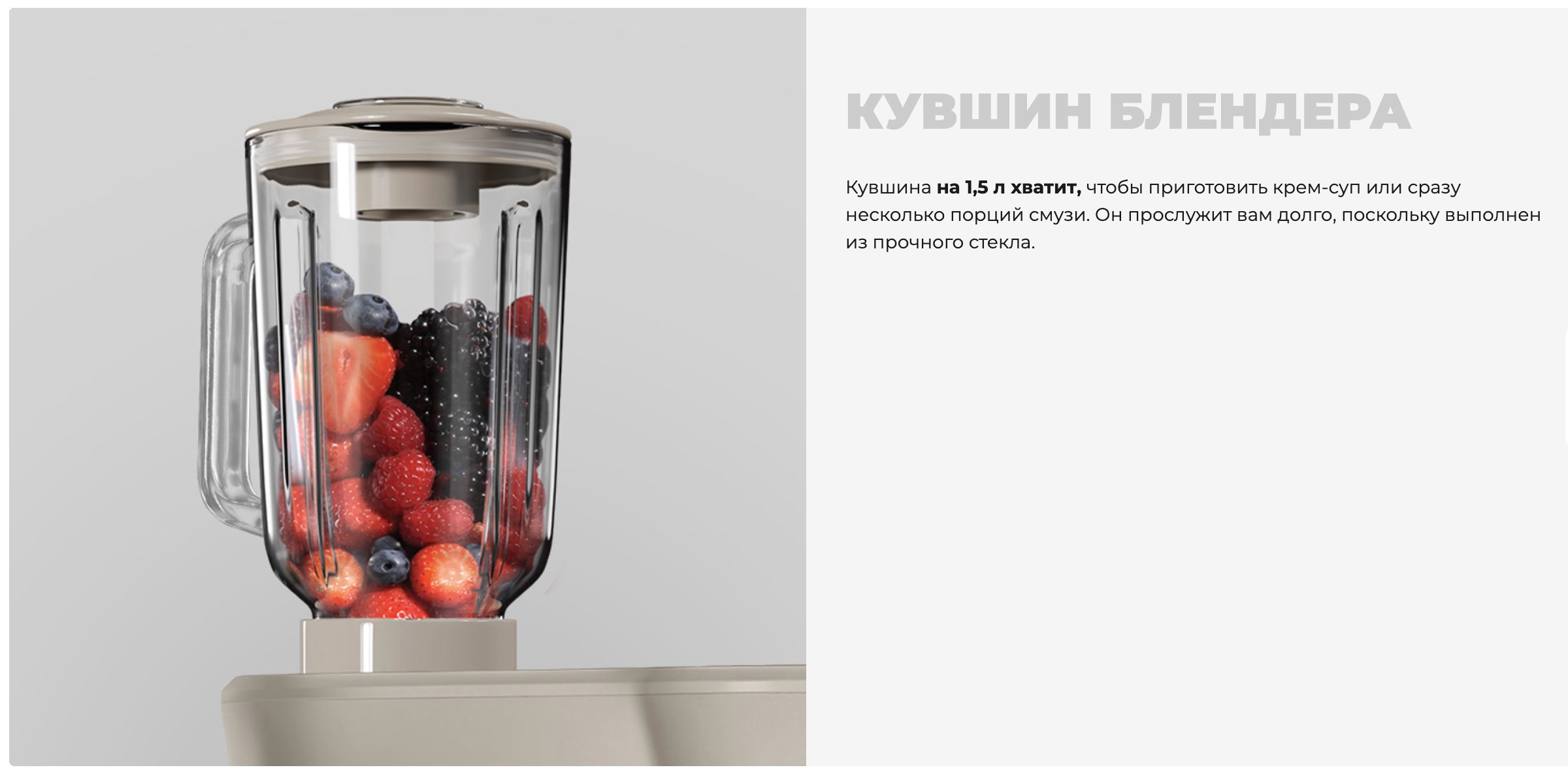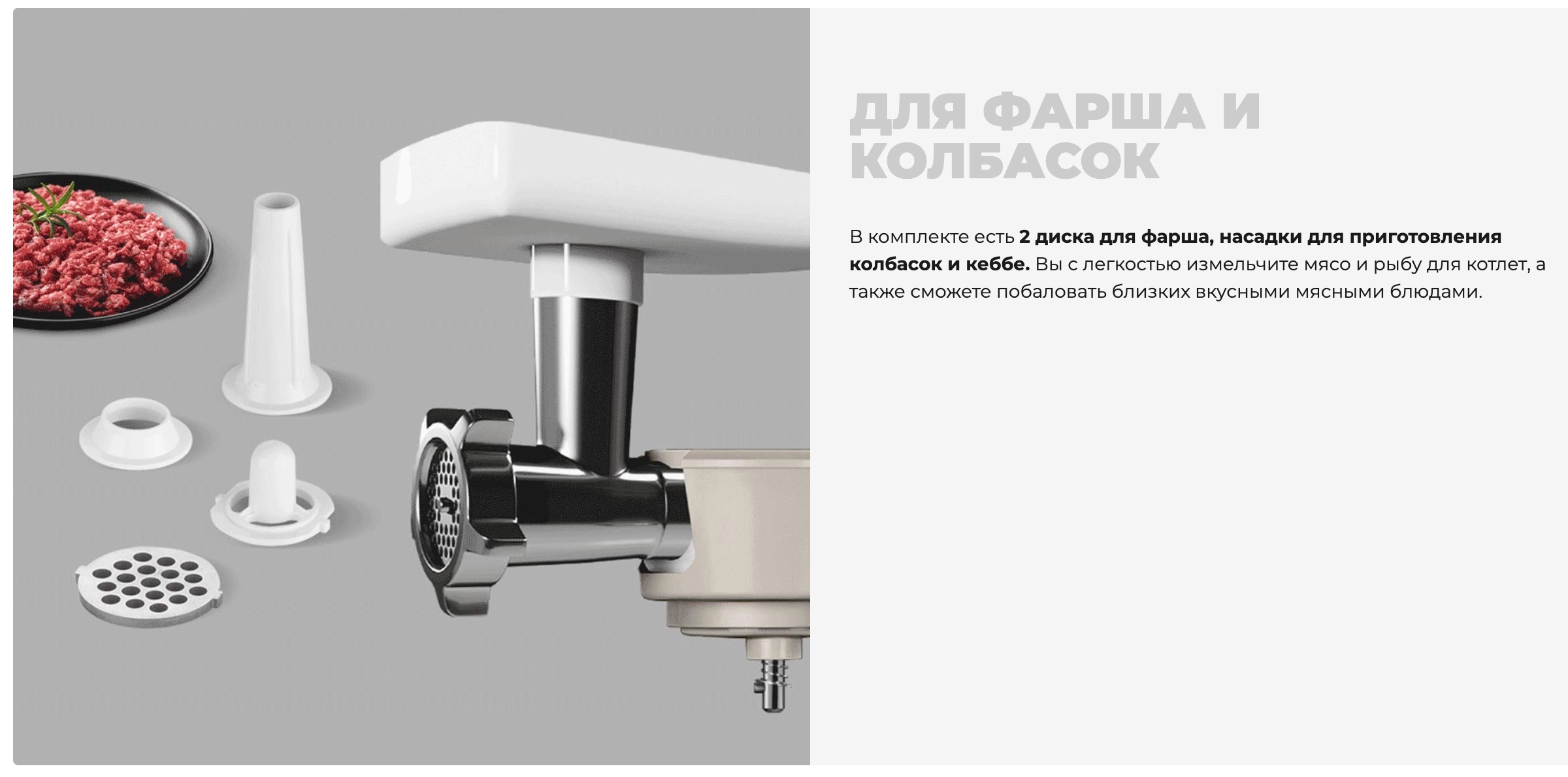БрендRedmond Потребляемая мощность1200 Вт Количество скоростей6 Количество функций4 Насадки и дискиНасадка для приготовления кеббе, Насадка для нарезки овощей, Венчик, Насадка для приготовления колбасок, Для замешивания теста ФункцииМиксер, Мясорубка, Блендер, Шинковка