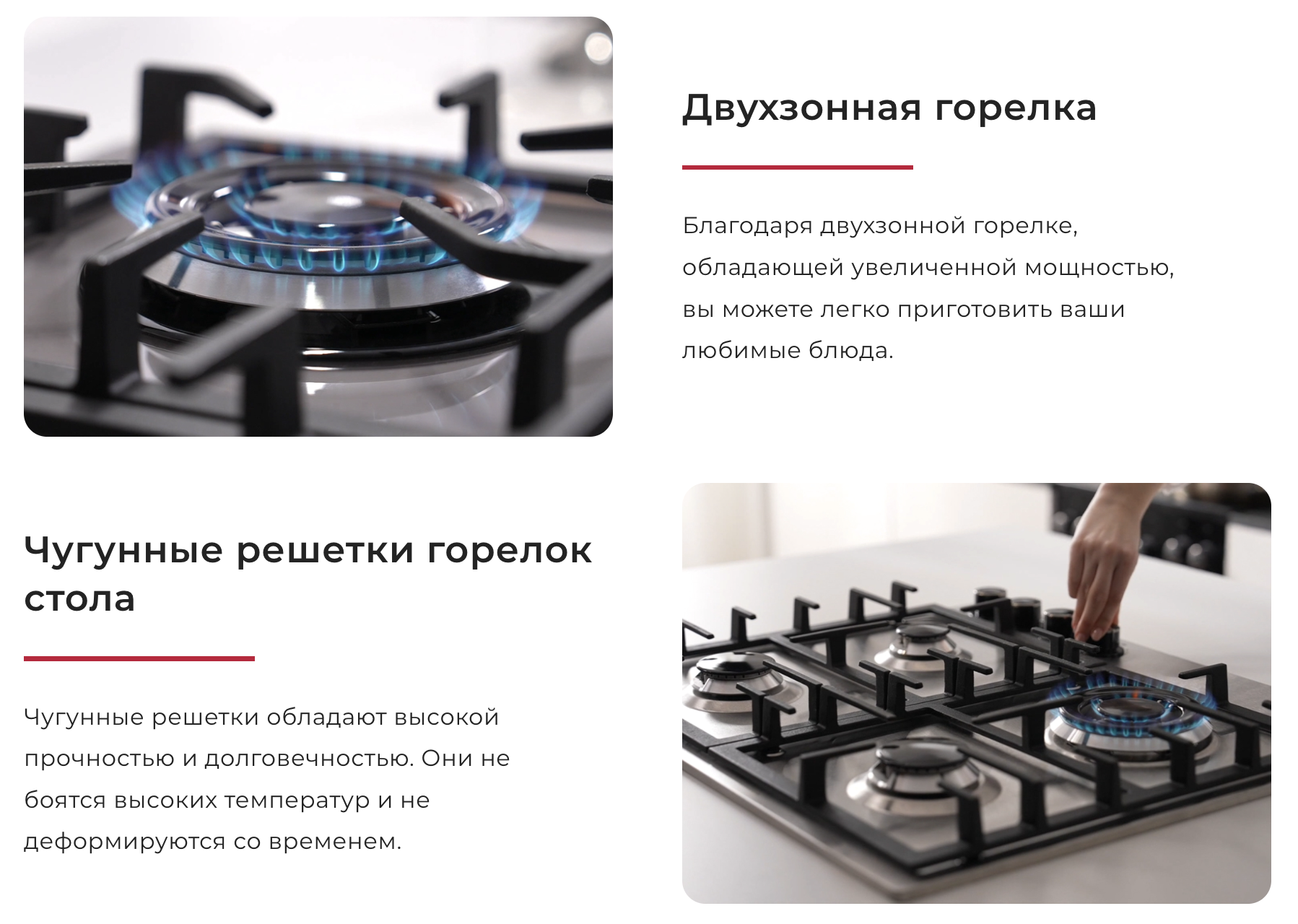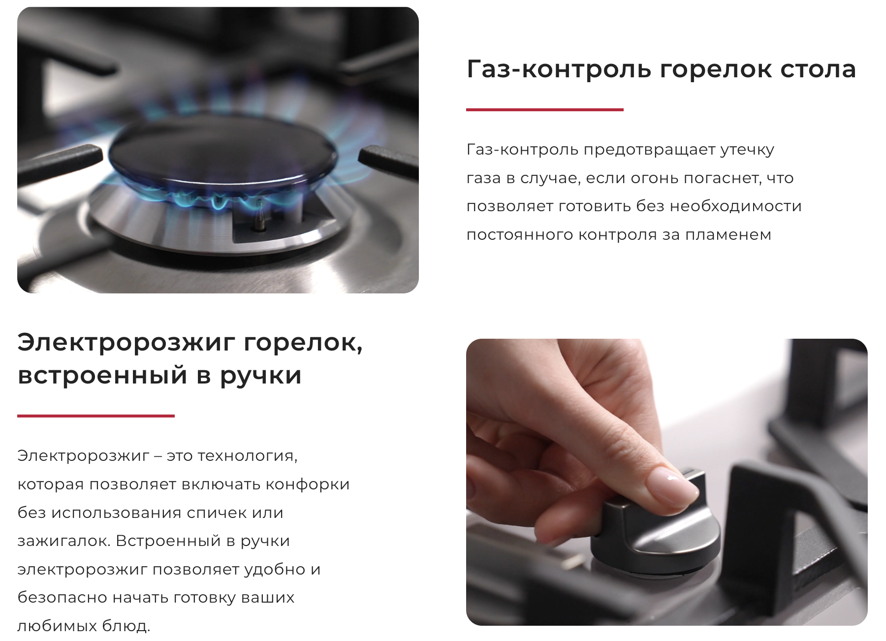 Электрический розжиг с помощью искры, который не требует использования спичек. Может быть встроенным в ручки управления или быть в виде кнопки на панели.