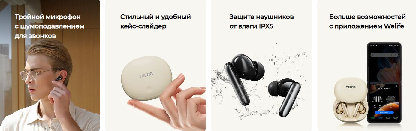 Tecno True 1 Air с закрытой акустикой выдают громкий звук с хорошей проработкой басов и сохранением четкости вокала.