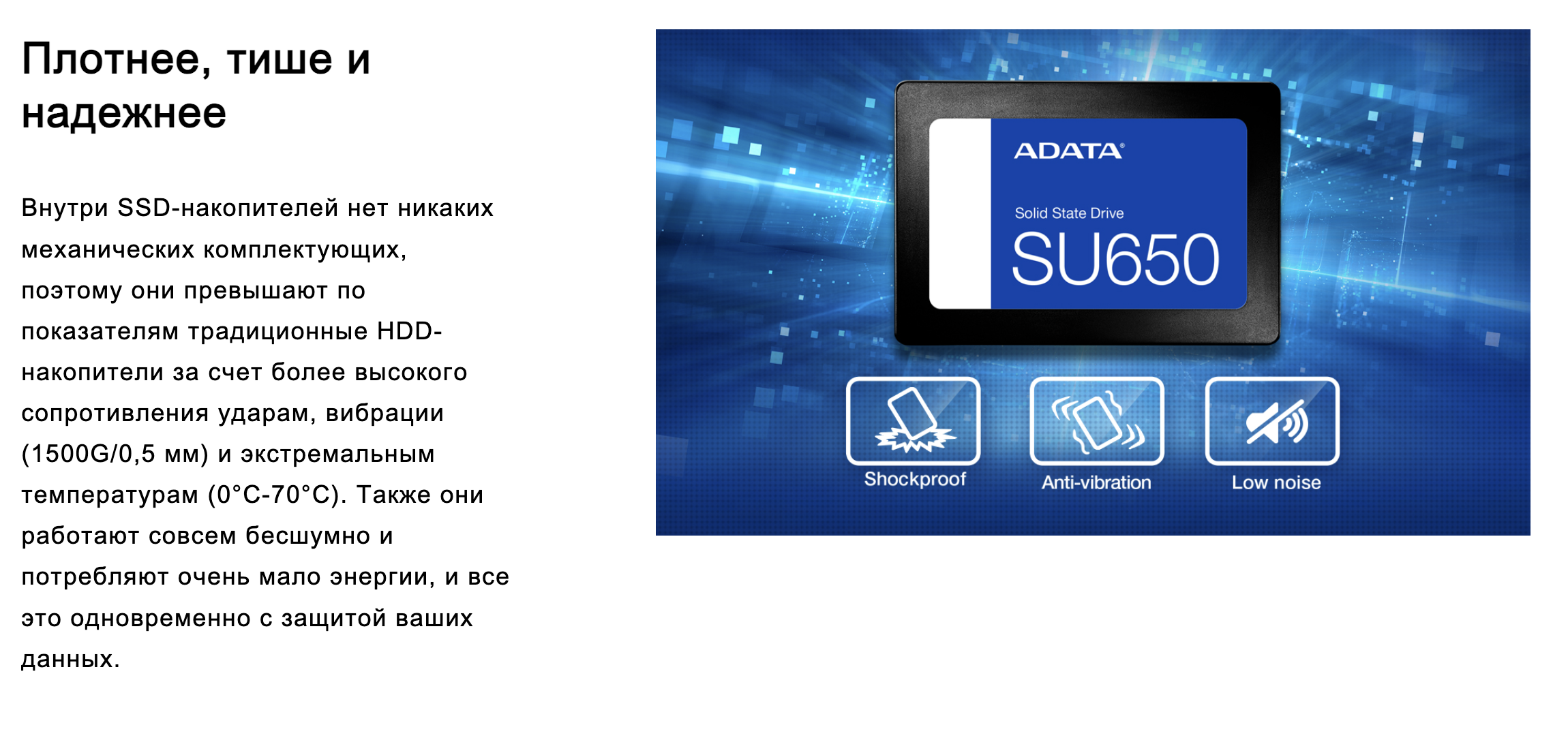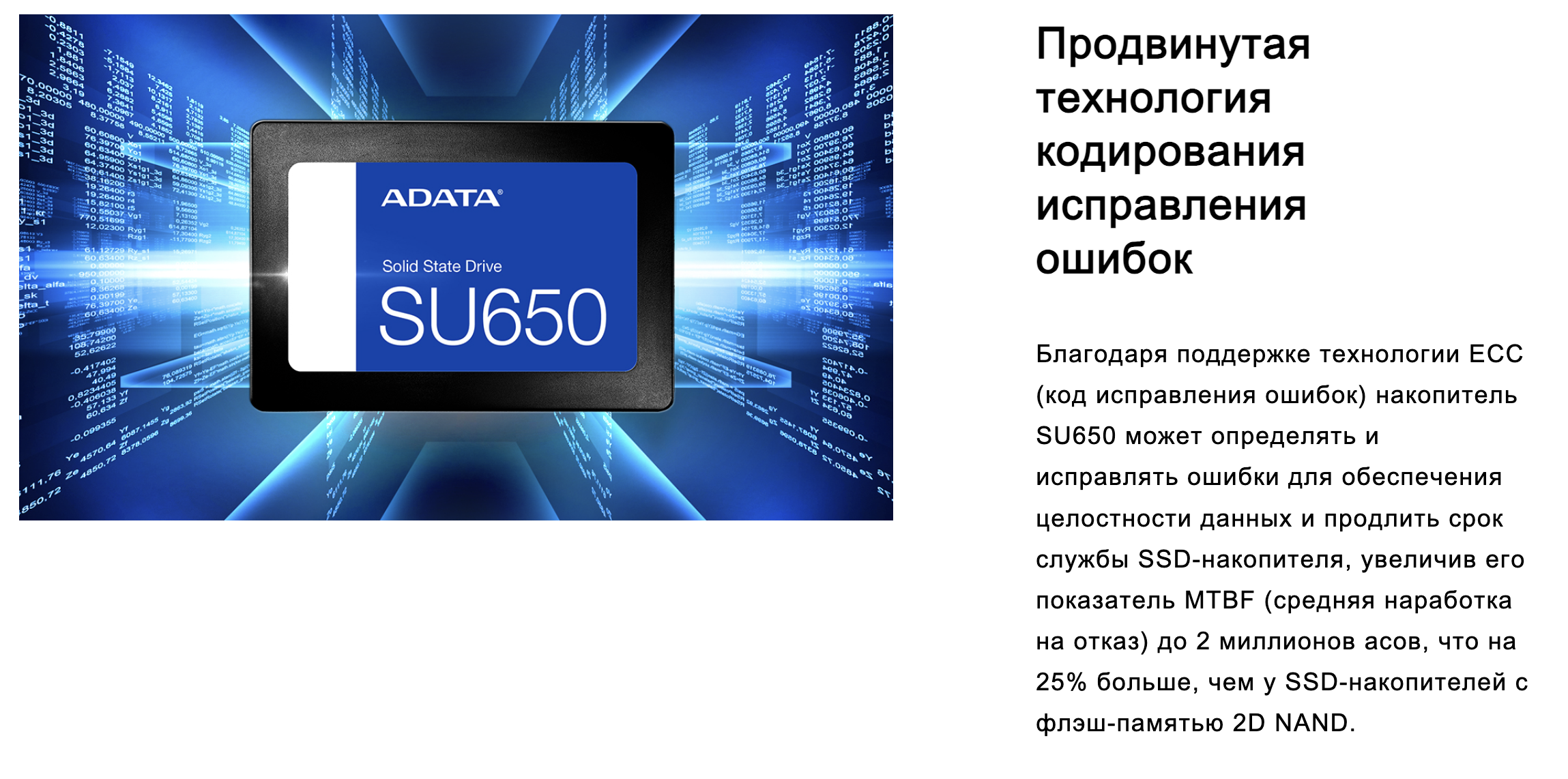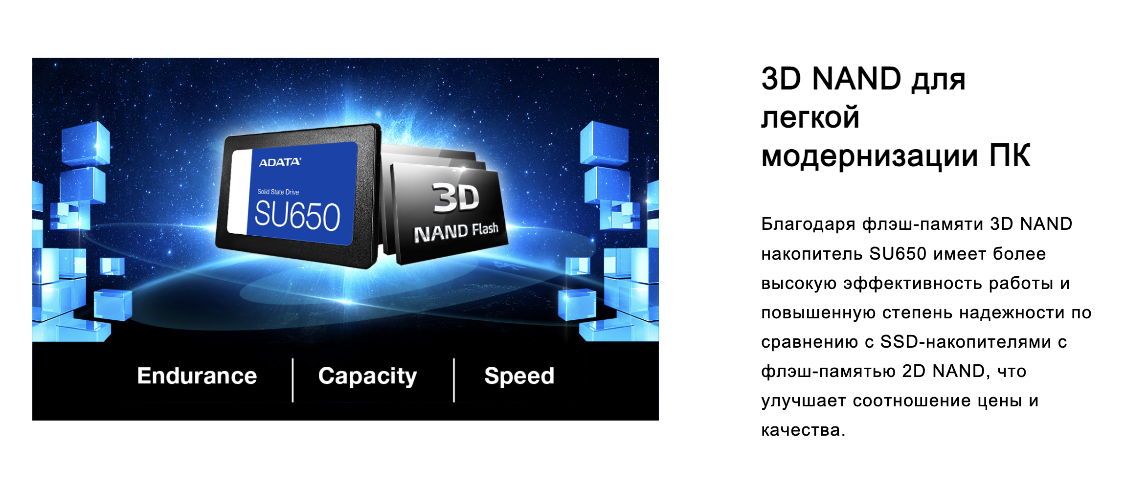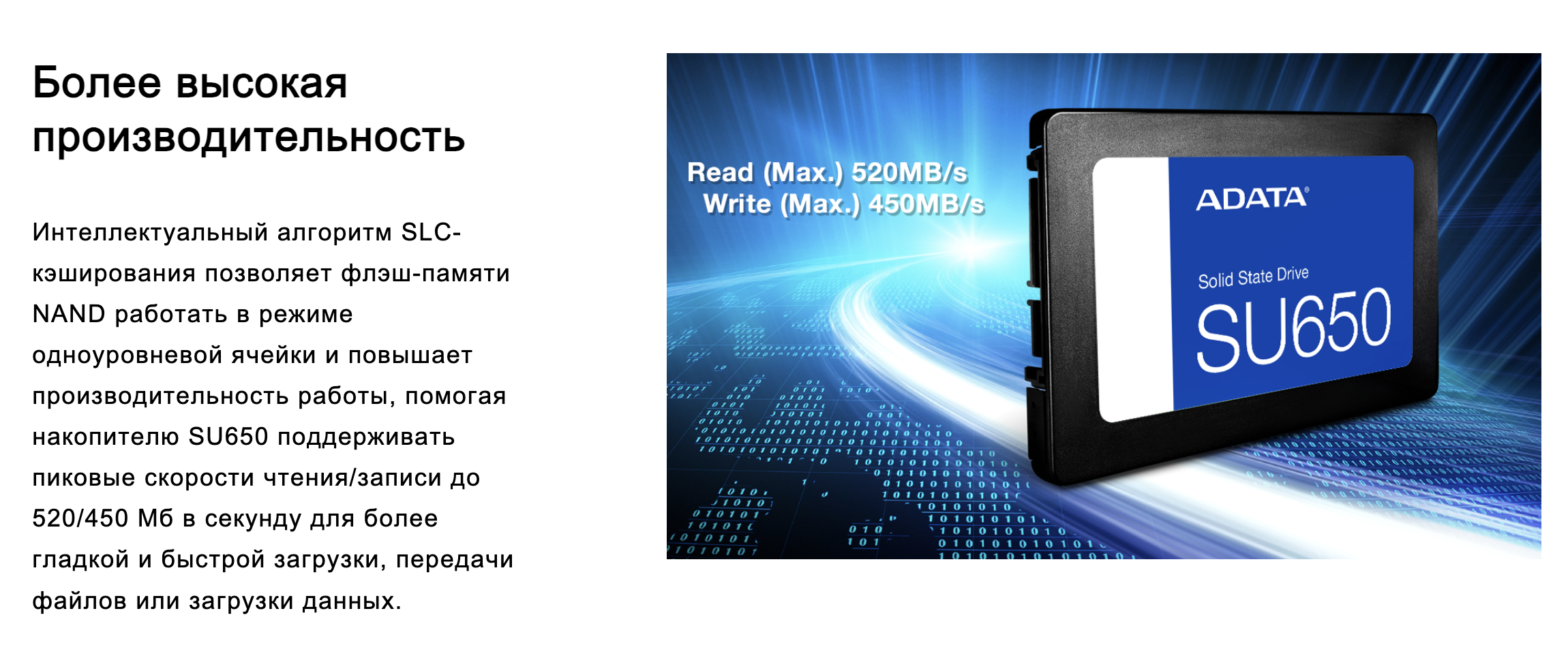 Твердотельный накопитель Ultimate SU650 оснащен флэш-памятью 3D NAND и высокоскоростным контроллером, благодаря чему емкость накопителя увеличивается до 2Tб. Накопитель обеспечивает скорость чтения/записи до 520/450 Мб/с и более высокую надежность в сравнении с SSD-накопителями с флэш-памятью 2D NAND. SU650 оснащен SLC-кэшированием и продвинутыми технологиями исправления ошибок, что обеспечивает целостность данных и их оптимизированную обработку. Для тех, кто хочет попробовать полное обновление ПК, накопитель SU650 — это великолепный выбор с отличным отношением стоимости и производительности.