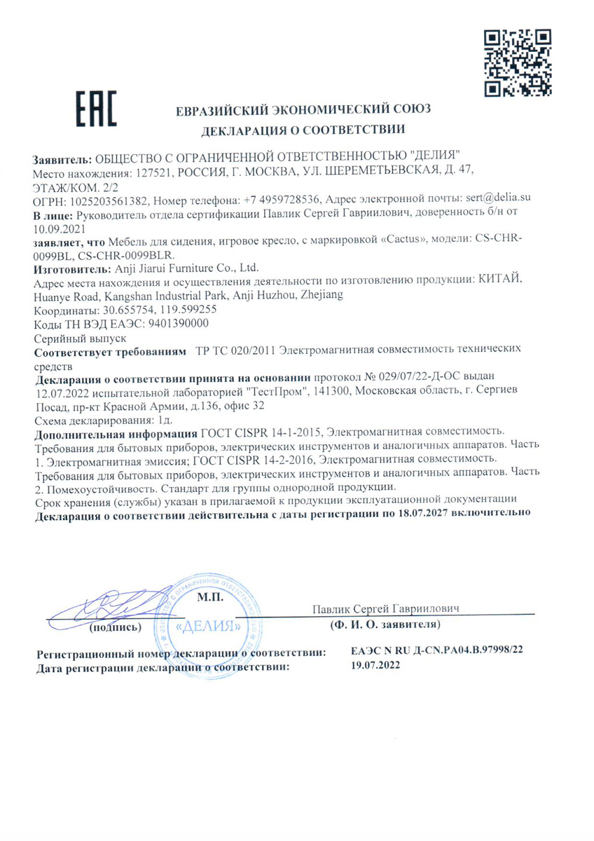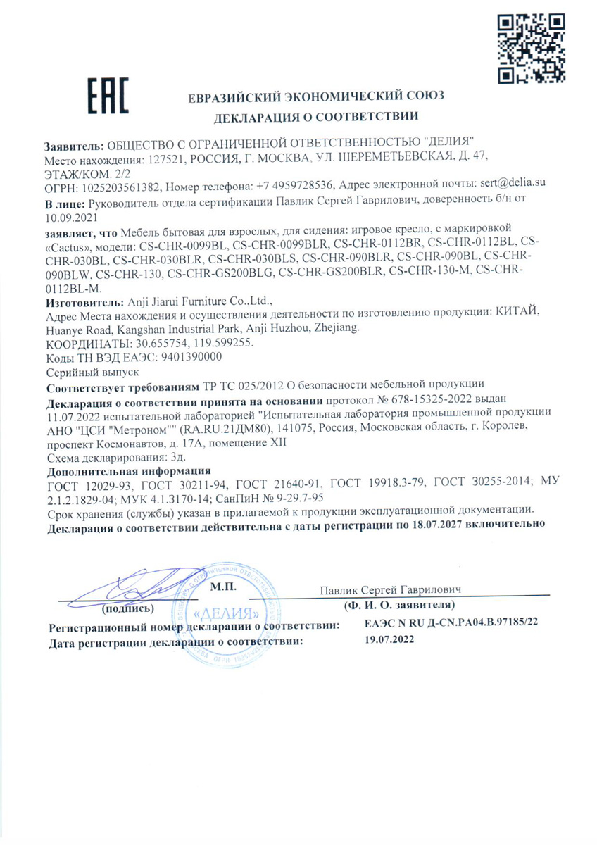 Какое бы кресло Cactus вы не выбрали, качество и стиль вас, несомненно, порадует. Производство кресел подтверждено по международным системам сертификации – BSCI, ROHS, EN1335, IS09001, CE.