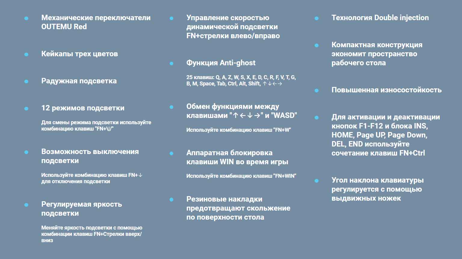 Сердцем клавиатуры являются механические переключатели Outemu Red, известные своей высокой отзывчивостью и плавностью хода.