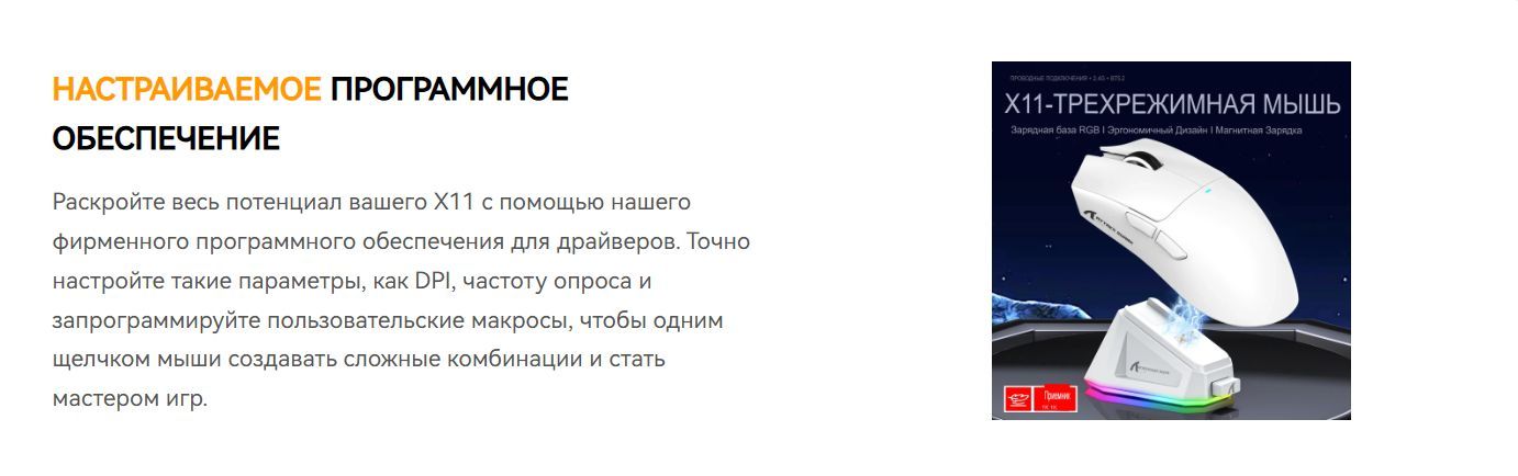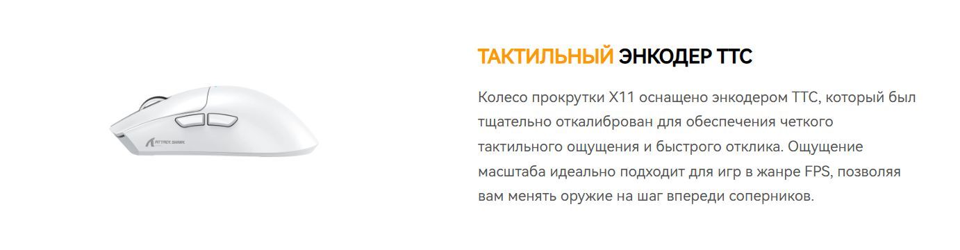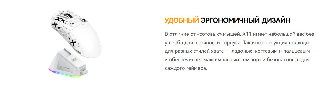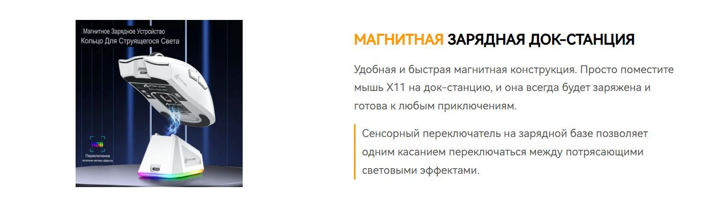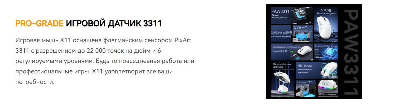 Игровая мышь Attack Shark X11 PAW3311 с док-станцией оснащена флагманским сенсором PixArt 3311 с разрешением до 22 000 DPI и 6 уровнями регулировки.