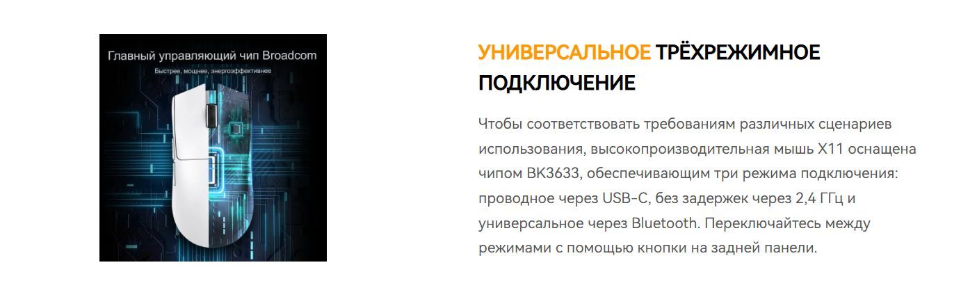 Есть три различных режима подключения проводной USB Type-C, Bluetooth, а также 2.4G, которые меняются с помощью кнопки на задней панели мыши.