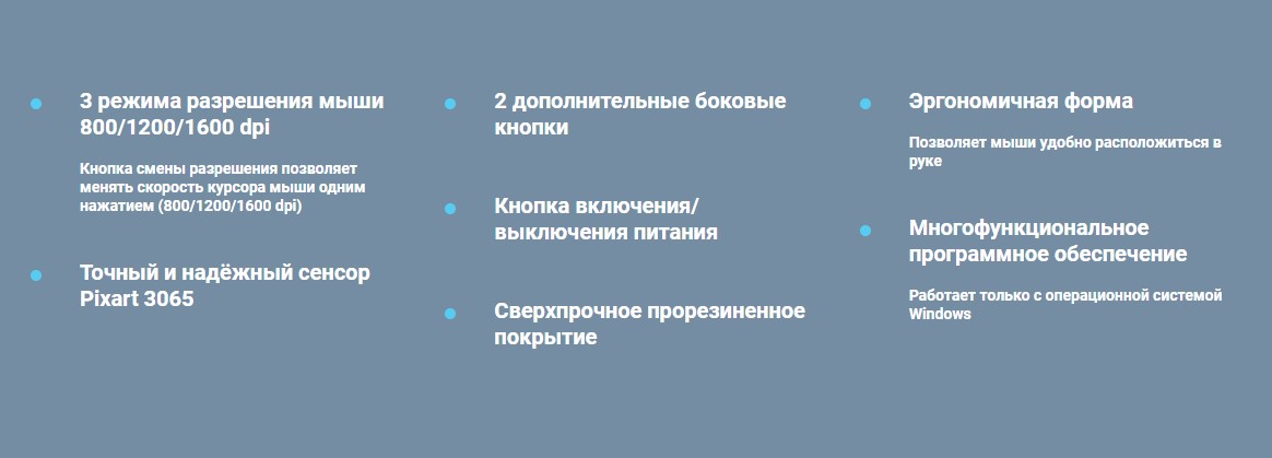 Эргономичная форма. 2 дополнительные боковые кнопки под большим пальцем. Управление скоростью перемещения курсора (800/1200/1600 dpi). Прорезиненная поверхность.