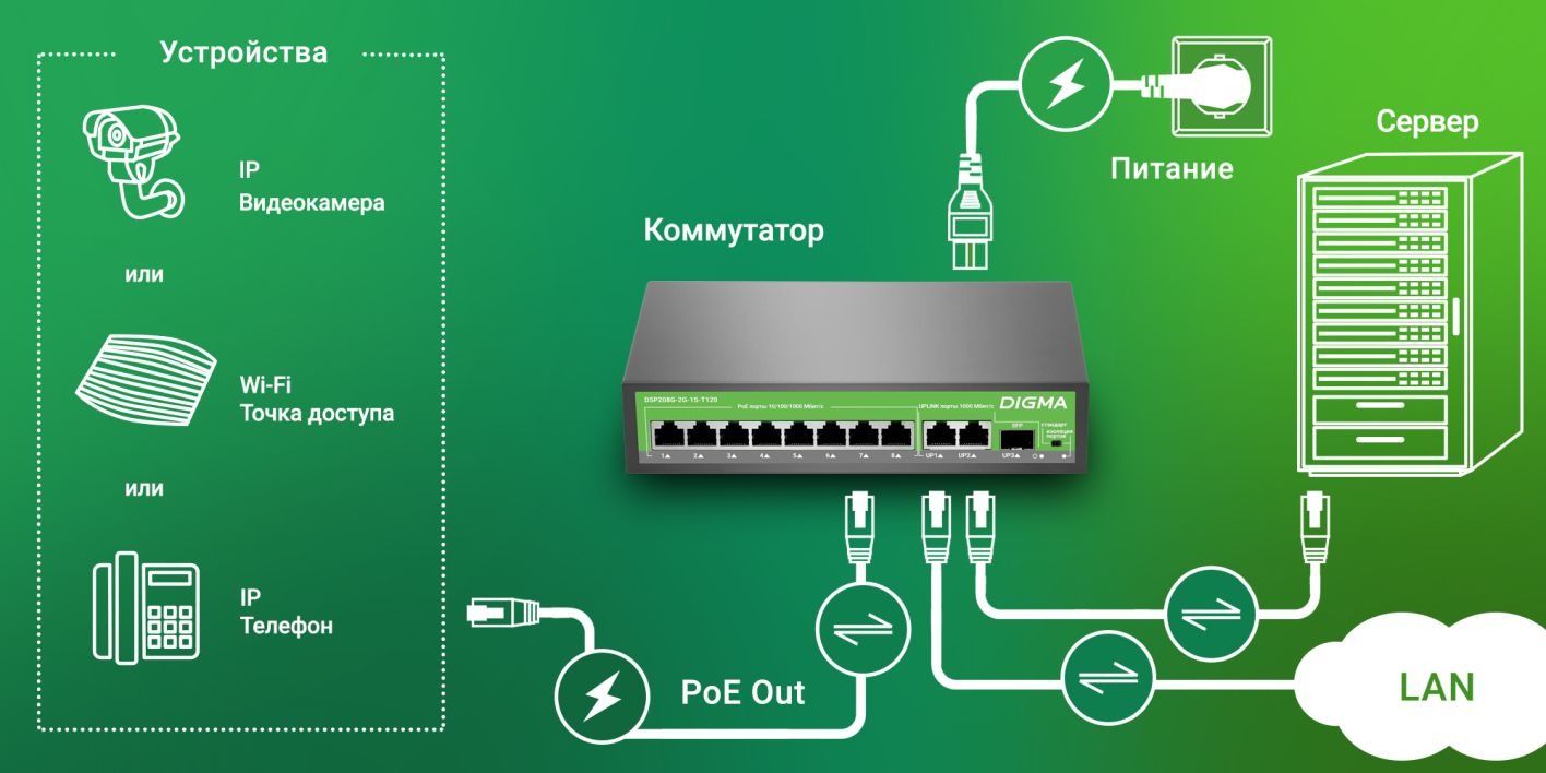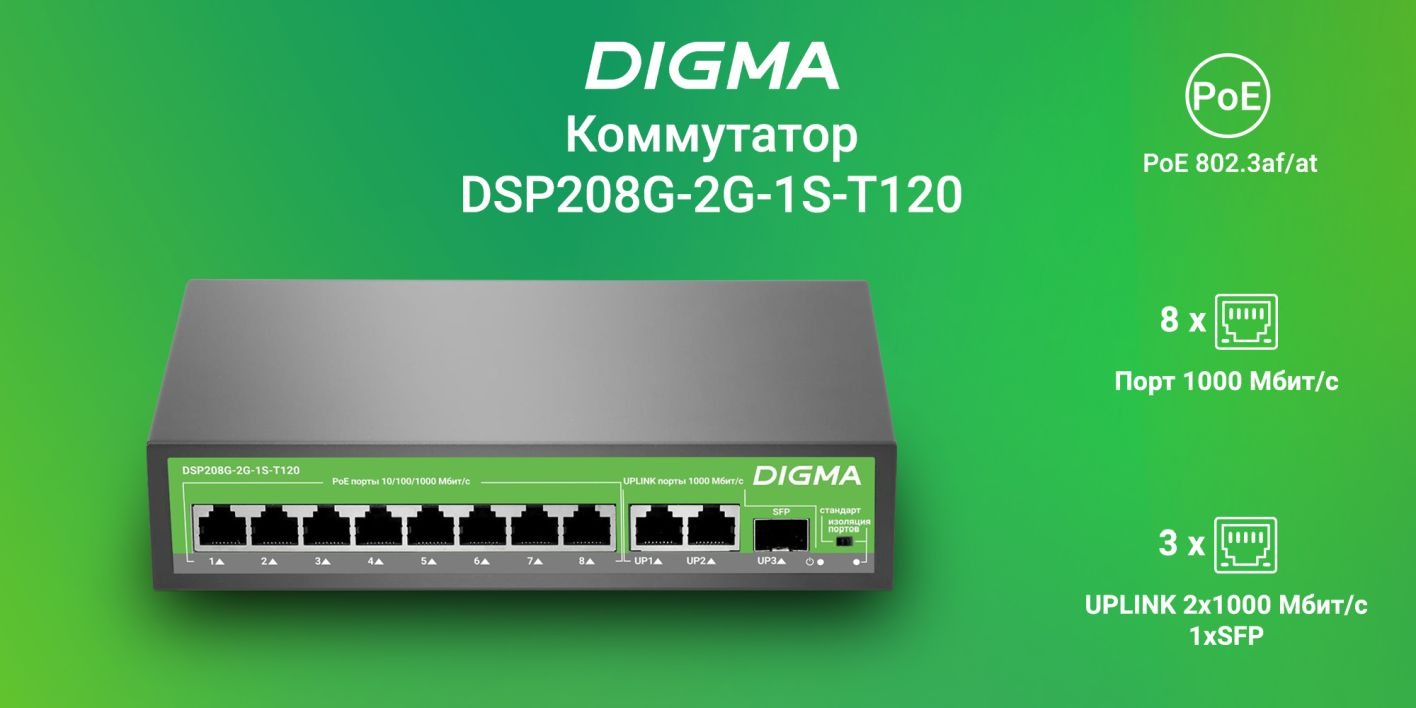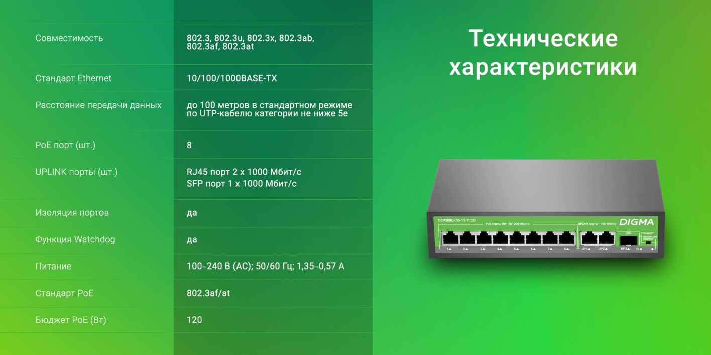 WAN-портEthernet Стандарт связи802.3, 802.3u, 802.3i, 802.3x, 802.3ab, 802.3af, 802.3at БрендDigma