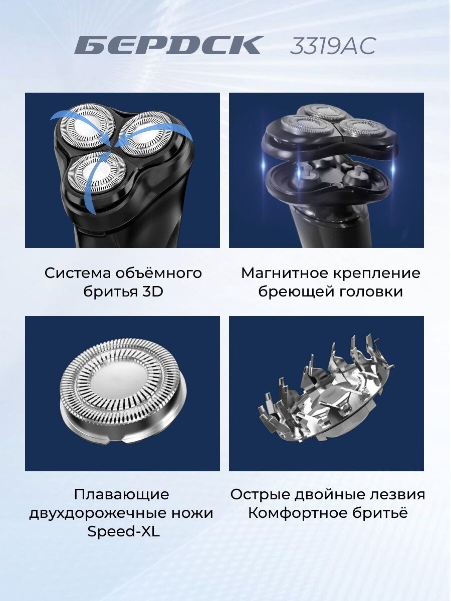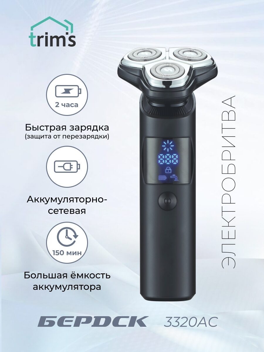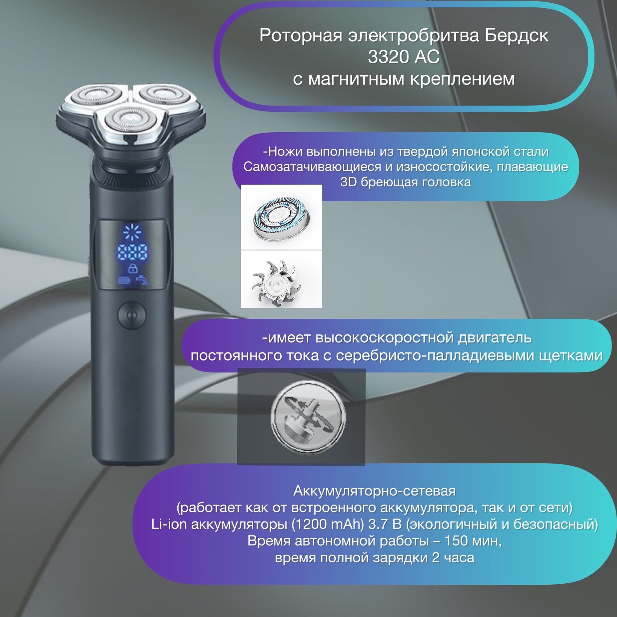 БрендБердск Тип бритвыРоторный Количество бритвенных головок/сеток3 Количество скоростей1 Время полного заряда2 ч Время автономной работы150 мин Питание бритвыОт сети, От аккумулятора Информационный дисплейЕсть Особенности бритвыИндикатор зарядки, Плавающая головка
